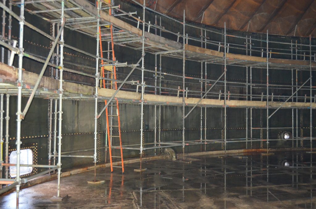 Works now commence to reline this 6m tall x 28m diameter effluent tank on a waste water treatment plant located at a leading pharmaceutical manufacturers in Ayrshire, Scotland.