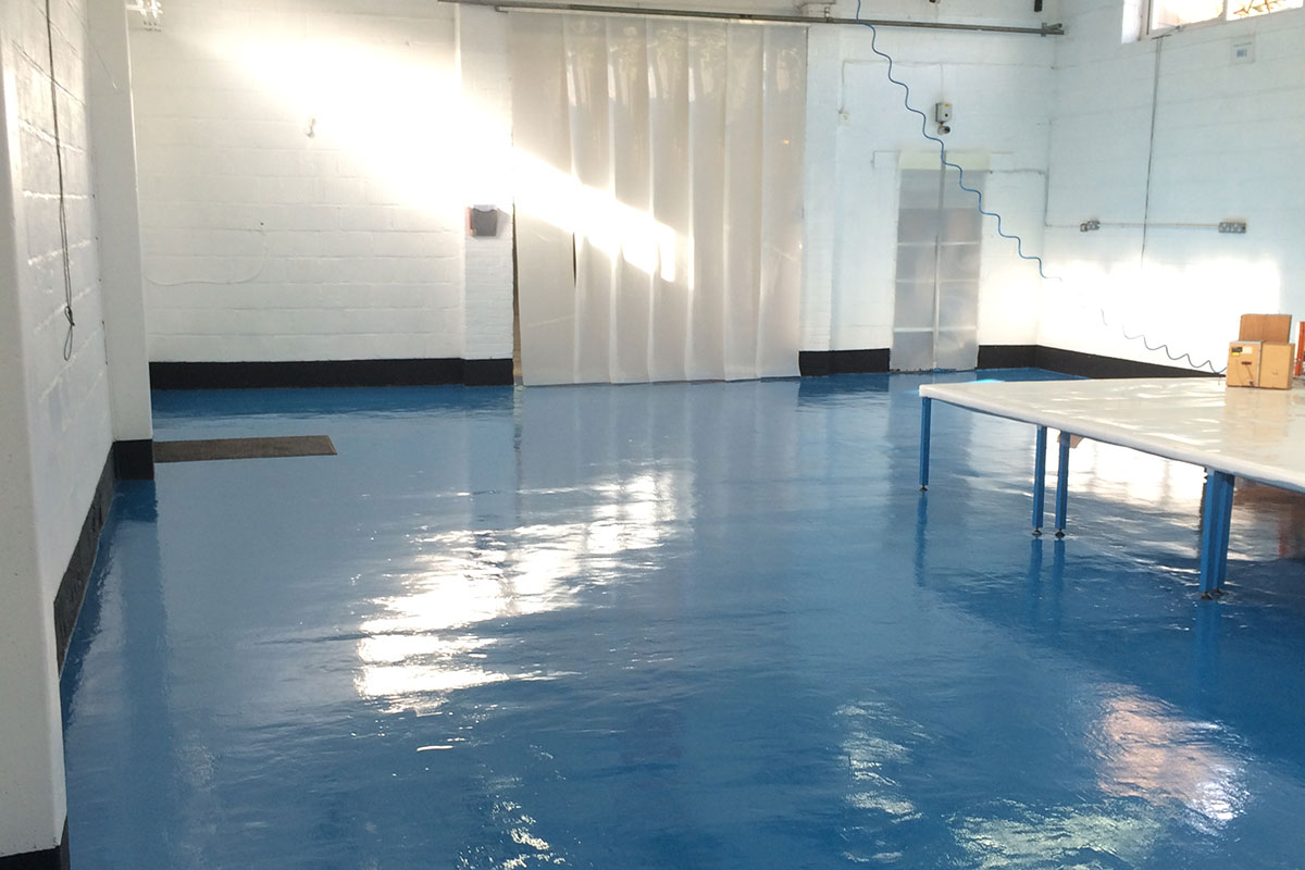 PPC (Philton Polythene converters) based in Canvey Island, Essex were looking for a suitable floor coating solution to refurbish their 300m2 production factory floor area. The existing concrete floor had two different covering systems already installed which had to be fully removed before LAM could apply any new floor coating product. After careful consideration the client chose to have a high build epoxy paint system installed following specialist diamond floor grinding preparation. Prior to application of the new paint system several moisture sleeves were installed and readings were taken to establish the moisture levels within the slab. The moisture tests highlighted that there was an unacceptably high moisture content which would ultimately affect the bond strength between the paint and the substrate. To overcome this problem LAM specified a liquid damp proof membrane prior to application of the high build epoxy coating. This meant that the paint could achieve 100% bond strength. The works were carried out over a 7 day window during a shutdown period where all of the production tables and machinery could be removed to expose all of the floor area.